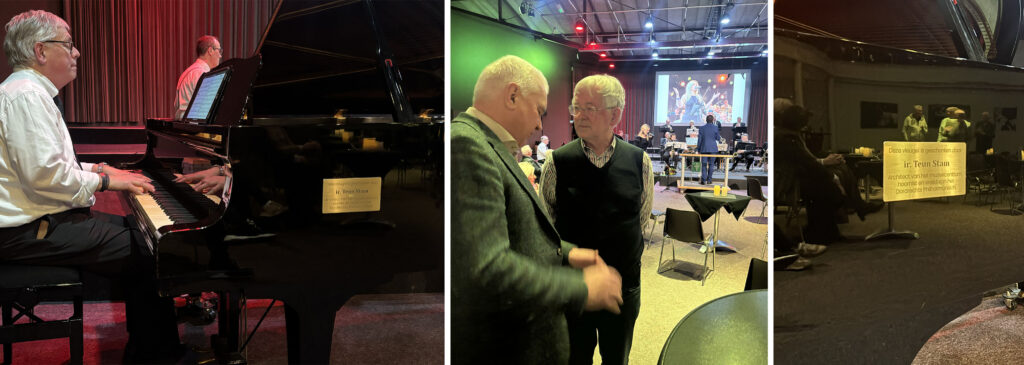 Mooi was dat hun muzikale leider de primeur had om ‘onze’ vleugel voor het eerst te bespelen. U zal denken ‘die staat daar toch al jaren’. Dat klopt. Maar…..wat niet veel mensen wisten, dit instrument was formeel nog in eigendom van architect en lid Teun Stam. Teun heeft, bij het ontwerpen van ons muziekcentrum, zijn honorarium omgezet in de aanschaf van deze vleugel. Nu vond Teun het tijd om ook in formele zin de vleugel in eigendom over te dragen aan het Dordrechts Phiharmonisch. Als blijk van dank heeft de vereniging de vleugel van een mooie plaquette voorzien waarmee deze dank een blijvend karakter heeft.
