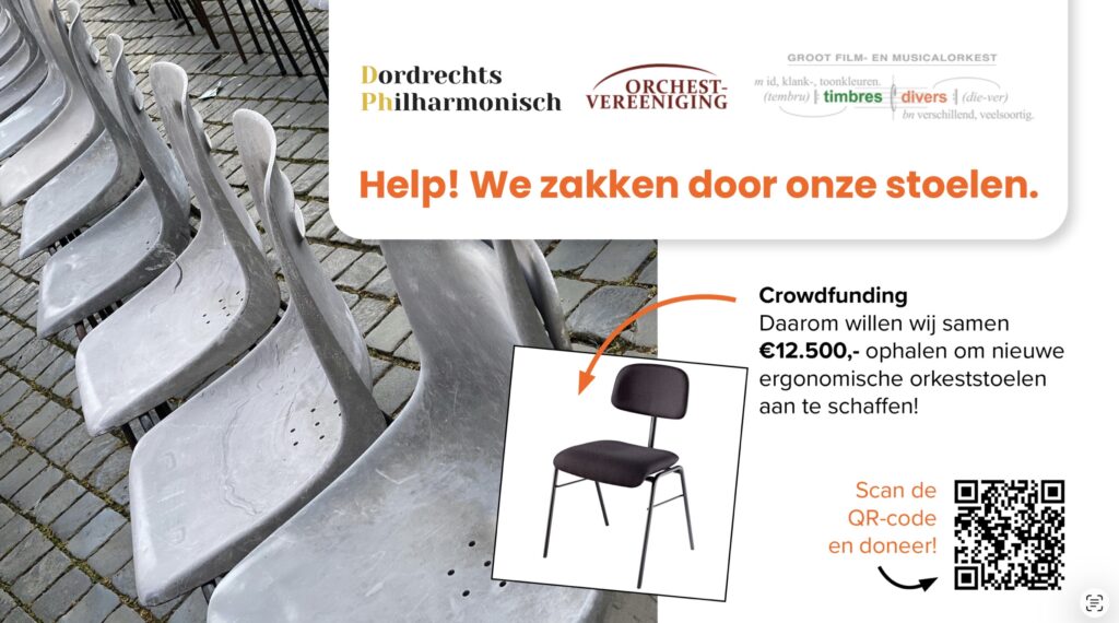 Het Dordrechts Philharmonisch, Orchest Vereeniging Dordrecht en het Groot Film- en Musical Orkest Timbres Divers maken samen al ruim 250 jaar muziek. Al 25 jaar repeteren de orkesten van de verenigingen in het Fidus Muziekcentrum. Door het intensieve gebruik zijn de stoelen aan vervanging toe en hebben we nieuwe nodig.